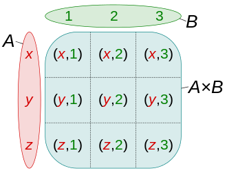 In mathematics, specifically set theory, the Cartesian product of two sets A and B, denoted A × B, is the set of all ordered pairs (a, b) where a is in A and b is in B.