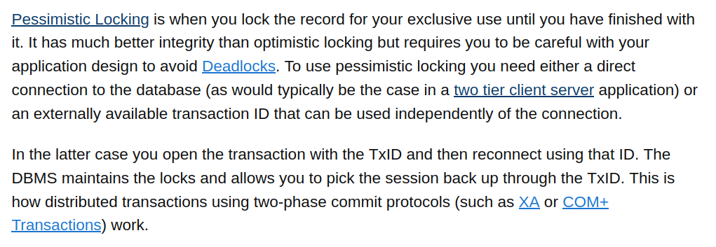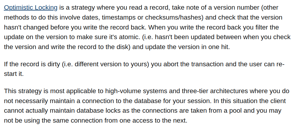 - https://stackoverflow.com/questions/129329/optimistic-vs-pessimistic-locking