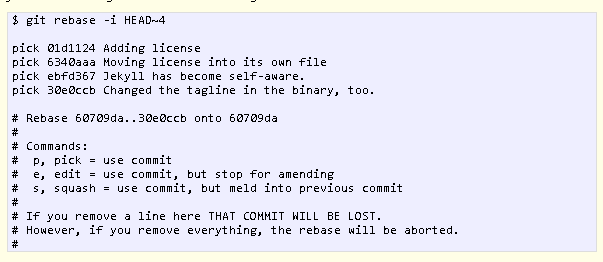 So, a few things have happened here. First of all, I told Git that I wanted to rebase using the last four commits from where the HEAD is with HEAD~4. Git has now put me into an editor with the above text in it, and a little explanation of what can be done. You have plenty of options available to you from this screen, but right now we’re just going to squash everything into one commit. So, changing the first four lines of the file to this will do the trick: