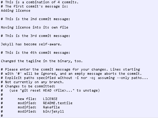 Basically this tells Git to combine all four commits into the the first commit in the list. Once this is done and saved, another editor pops up with the following: