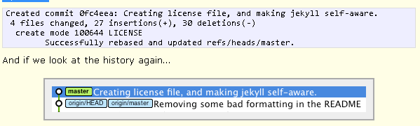 So, this has been a relatively painless so far. If you run into conflicts during the rebase, they’re usually quite easy to resolve and Git leads you through as much as possible. The basics of this is fix the conflict in question, git add the file, and then git rebase –continue will resume the process. Of course, doing a git rebase –abort will bring you back to your previous state if you want. If for some reason you’ve lost a commit in the rebase, you can use the reflog to get it back.