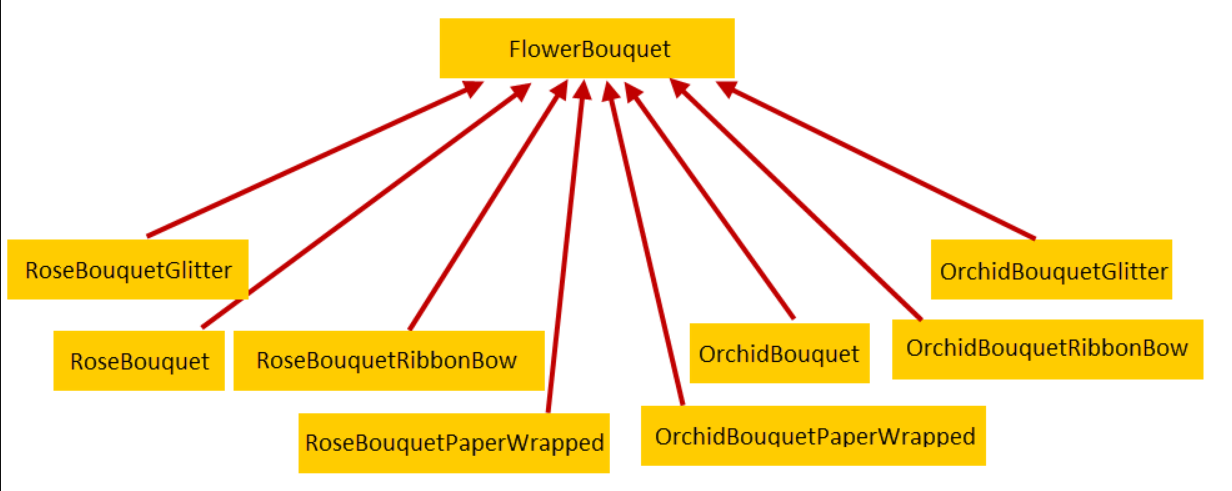 What we have is “class explosion” and that too while adding only a single decoration to a bouquet. Imagine representing a bouquet with multiple decorations, for example, a rose bouquet with both ribbon bow and glitter, or an orchid bouquet with a paper wrap, ribbon bow, and glitter. Some more considerations: