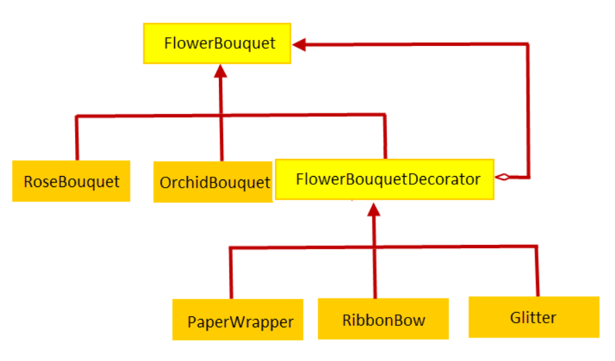 In the diagram above, the most important thing to observe is the relationship between FlowerBouquet and FlowerBouquetDecorator. We have two types of relationships: