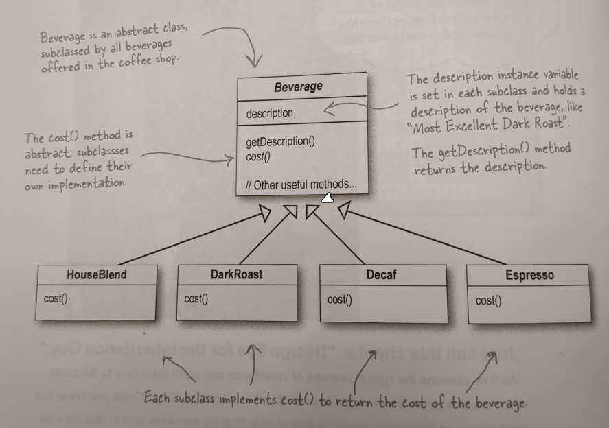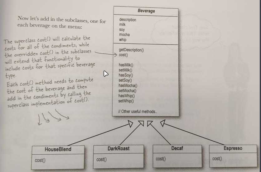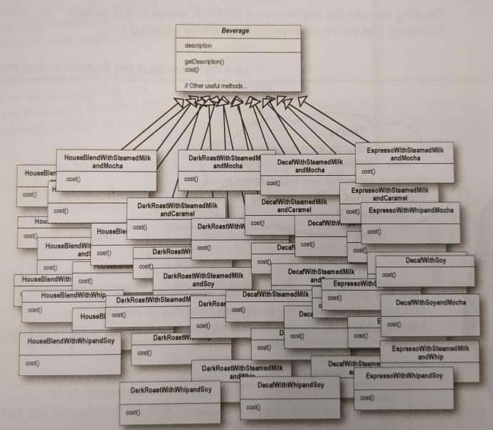 - We may have new beverages. For some of these beverages (iced tea), the condiments may not be appropriate. Yet, the tea subclass will still inherit methods like hasWhip()