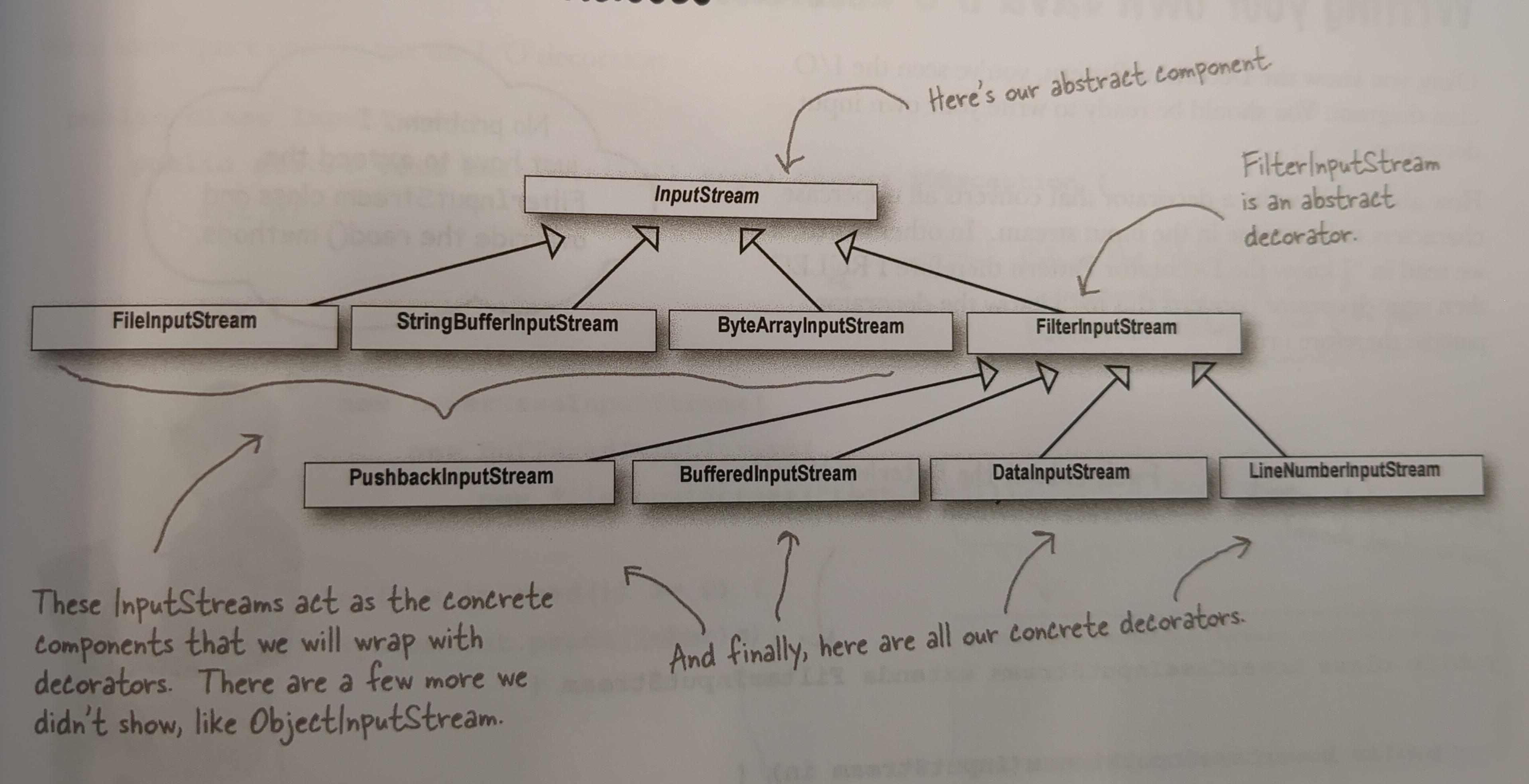 - FileInputStream, StringBufferInputStream and ByteArrayInputStream act as the concrete components that we will wrap with decorators. There are a few more that are not shown here - like ObjectInputStream.