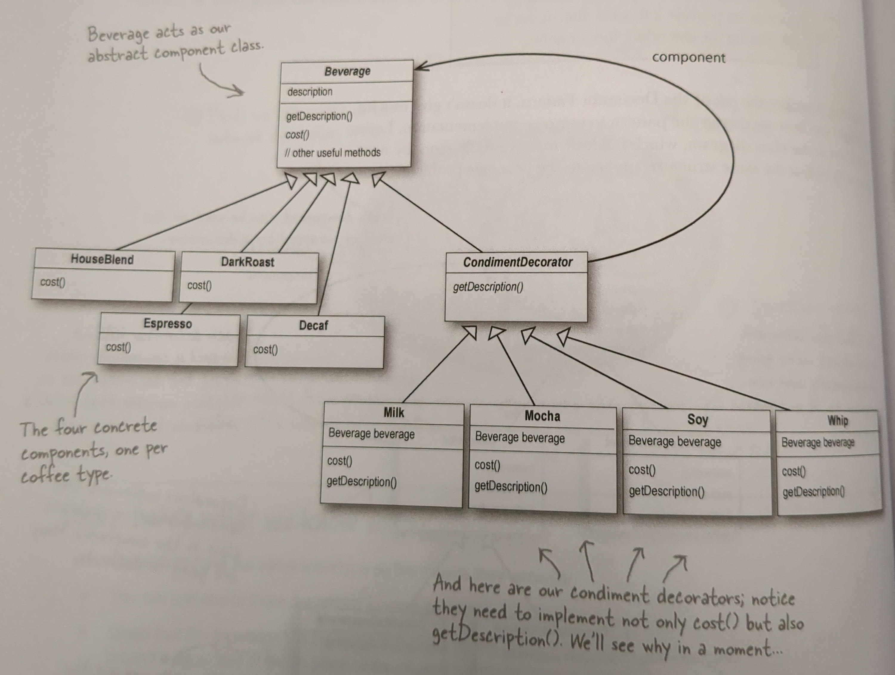 We start with a beverage and decorate it with the condiments at runtime. e.g. if a customer wants a Dark Roast with Mocha and Whip, we will
