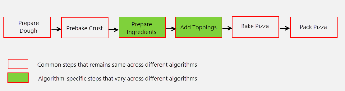 As you can see in the figure above, the Prepare Dough, Prebake Crust, Bake Pizza, and Pack Pizza steps will be common across all pizza making algorithms. Our restaurant wants to maintain standards and so does not allow the different pizza maker algorithms to have their own way of preparing dough, prebaking crust, baking pizza, and packing them. The Prepare Ingredients and Add Toppings are algorithm specific. This is apparent because Prepare Ingredients for veg pizzas will obviously be different from non-veg pizzas. Similar is the case for the Add Toppings step.