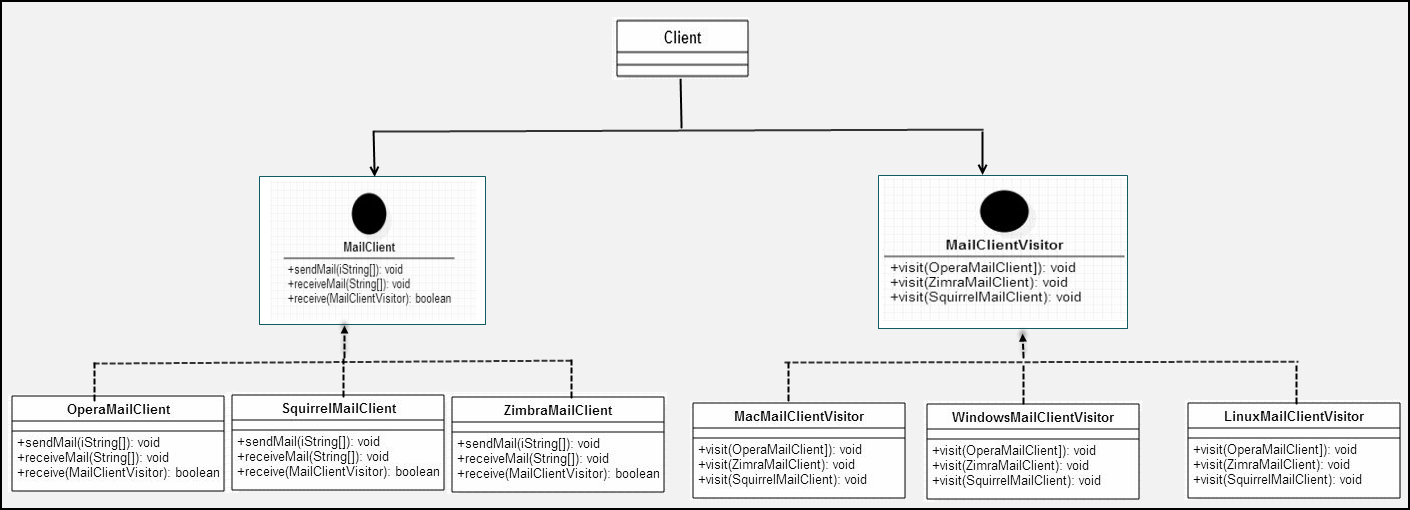 - ConcreteVisitor (MacMailClientVisitor, WindowsMailClientVisitor, and LinuxMailClientVisitor): Are the concrete classes that implements each method declared by Visitor.