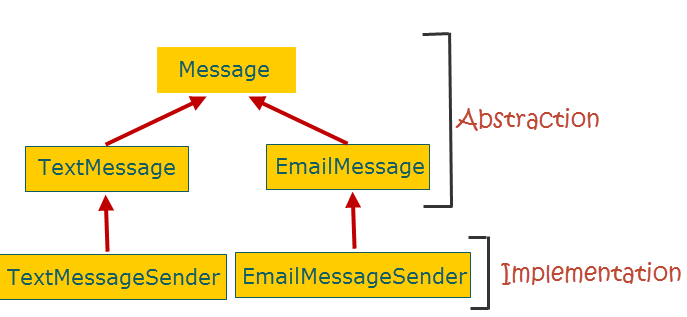 At first sight, there appears nothing wrong in the design above. But if you look deep you will notice that the abstraction part- the part that clients interact with, and the implementation part- the part that provides the core functionality of sending messages, are tightly integrated. Our design relies on inheritance and one inherent disadvantage is that it breaks encapsulation. As a developer of the EmailMessageSender subclass, you have to know about the internals of the EmailMessage superclass, which means the encapsulation in the superclass is broken.