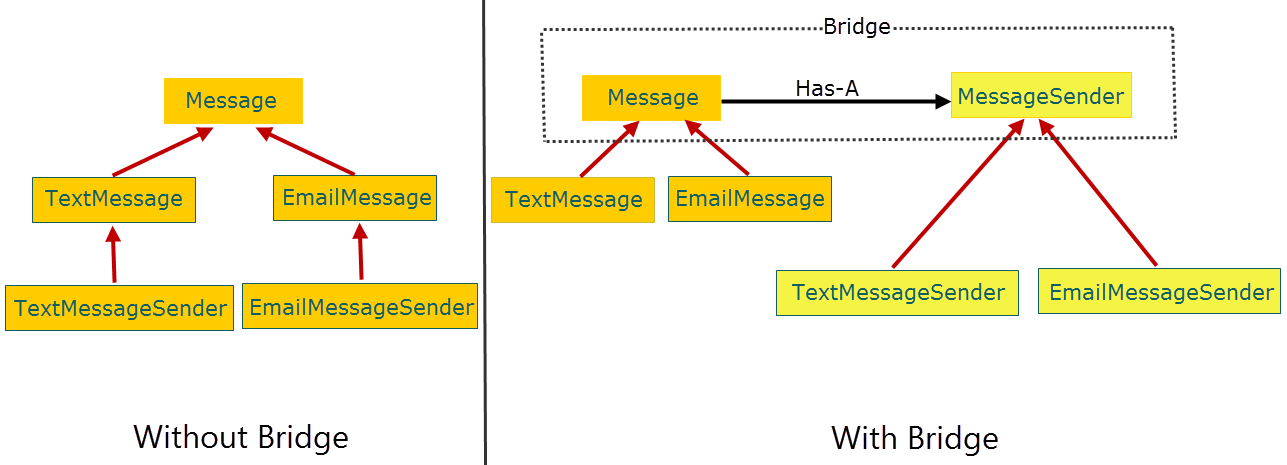 - ConcreteImplementor(TextMessageSender and EmailMessageSender): Are concrete subclasses that implements Implementor.