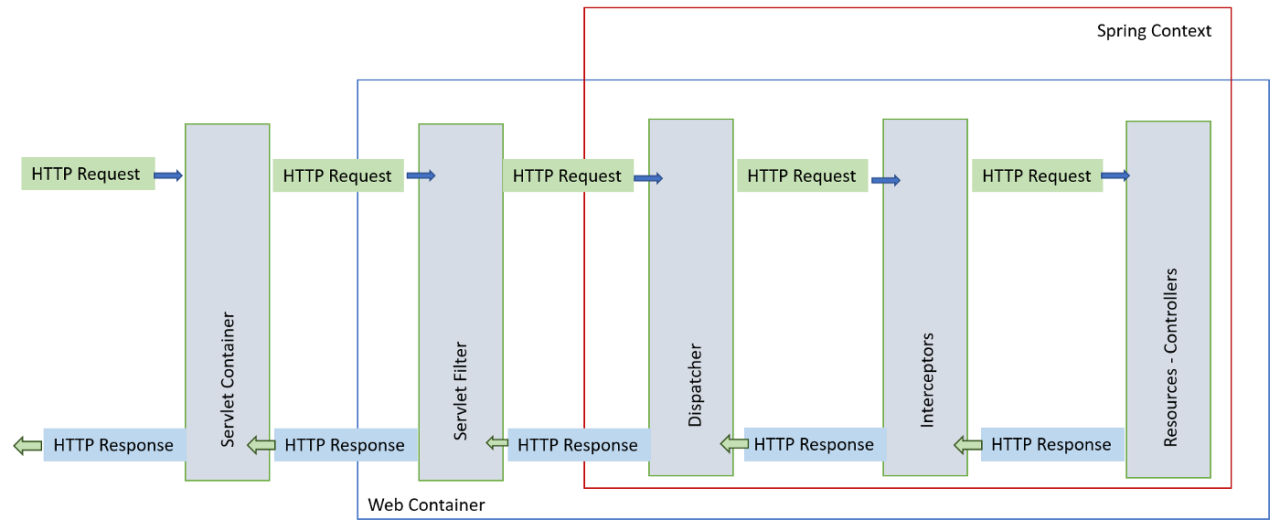 | HandlerIntercepors intercepts requests between the DispatcherServlet and our Controllers. | Filters intercept requests before they reach the DispatcherServlet |