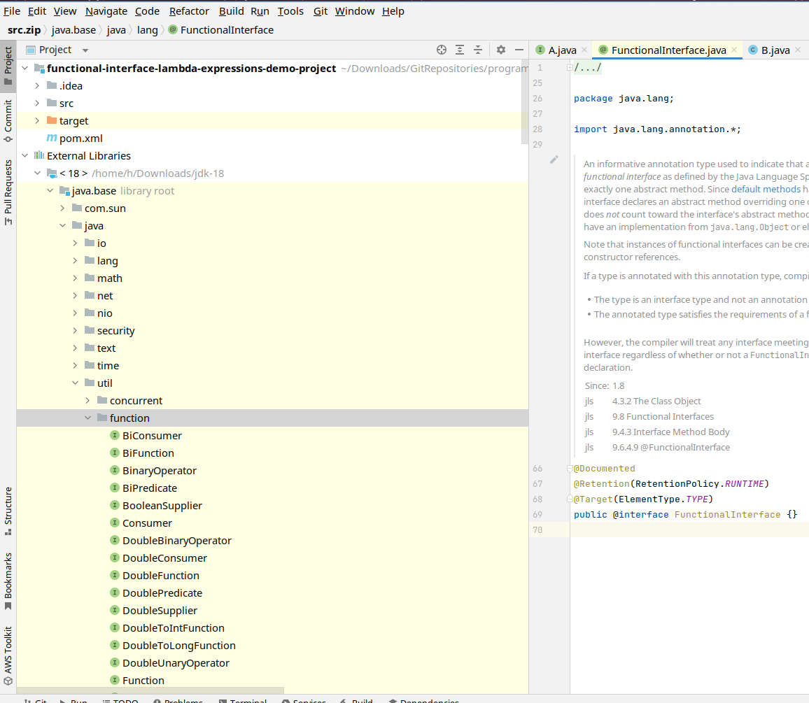 Functional interfaces often represent abstract concepts like functions, actions, or predicates. In documenting functional interfaces, or referring to variables typed as functional interfaces, it is common to refer directly to those abstract concepts, for example using “this function” instead of “the function represented by this object”. When an API method is said to accept or return a functional interface in this manner, such as “applies the provided function to…”, this is understood to mean a non-null reference to an object implementing the appropriate functional interface, unless potential nullity is explicitly specified.