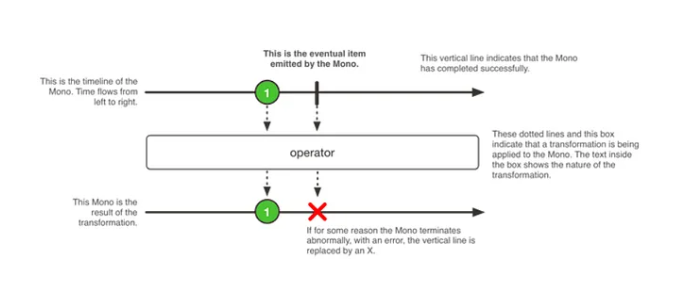 - As shown in the image, only one item will be published by the Publisher to the Subscriber. The last line represents the completion of the stream. The operator box represents the transform operation for this Mono stream.