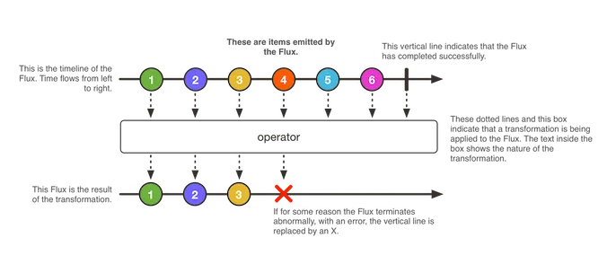 - The top side numbers are the N items which are published by the Publisher to the Subscriber. It is a type of Flux item stream and the last line represents the completion of that flux stream. The operator box represents the transform operation on that flux stream.